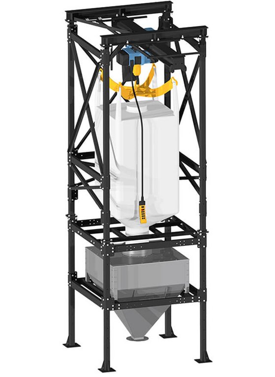 Diese BigBag-Entleerstation ist für gut rieselfähiges Mahlgut und Granulat geeignet. Der BigBag kann mit einem Elektro-Kettenzug komfortabel eingehängt werden.