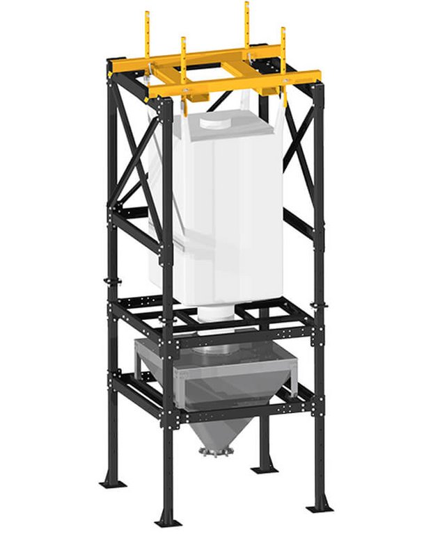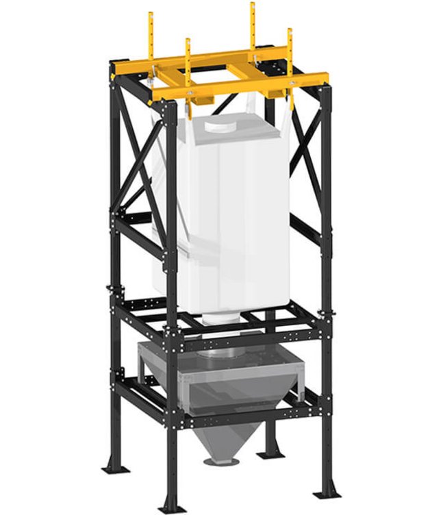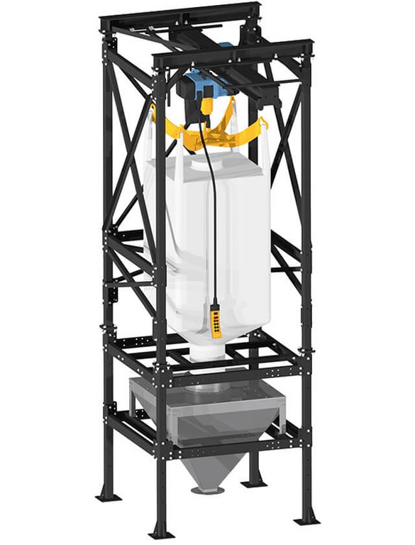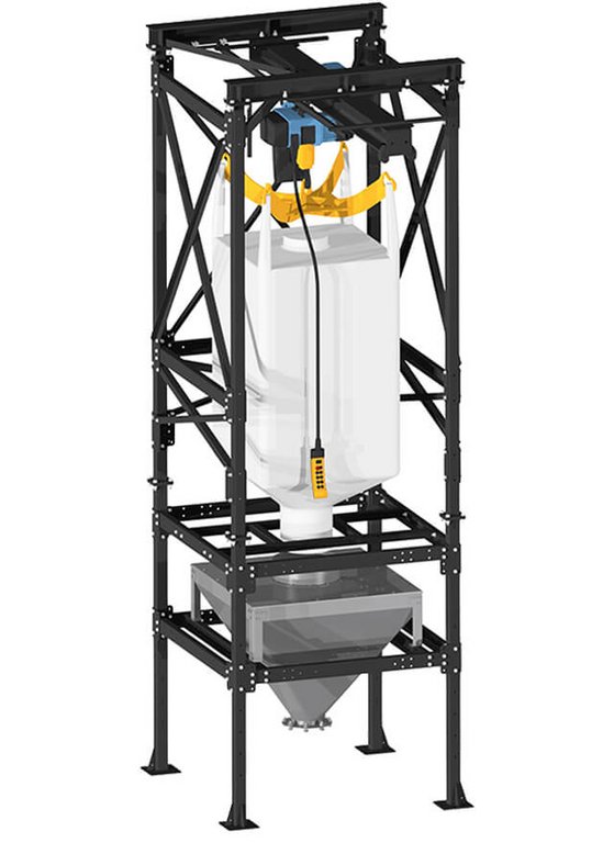 Diese BigBag-Entleerstation ist für gut rieselfähiges Mahlgut und Granulat geeignet. Der BigBag kann mit einem Stapler oder einem Elektro-Kettenzug komfortabel eingehängt werden.