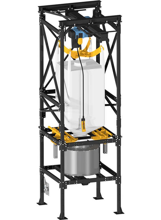 Diese BigBag-Entleerstation wurde speziell für das Lagern und Austragen von PET-Flakes konstruiert. Der BigBag wird mit einem Elektro-Kettenzug komfortabel eingehängt. Eine Walkeinrichtung lockert die PET-Flakes durch die Walkbewegungen auf und sorgt für den störungsfreien Austrag aus dem BigBag. Am Flachboden des Behälters räumt und dosiert ein Rührwerk die PET-Flakes in die Auslauföffnung.