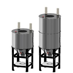 Der Auslauftrichter hat einen Öffnungswinkel von 90° oder 60°. Bei der Lagerung von Kunststoffmahlgut empfehlen wir 60°. Die Bodenfreiheit dieser Container ist für den Anschluss einer Zellenradschleuse samt Produktaufgabeschuh in den Anschlussgrößen DN150, DN200 oder DN250 vorgesehen. Die Leckluftrückführung ist vorbereitet und die passende Leckluftleitung bieten wir als Zubehör an. Die Leckluft entweicht über zwei Filtersäcke auf dem Silodach.