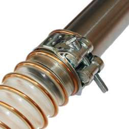 Dieser PVC-Schlauch wird als flexible Material- oder Vakuumleitung eingesetzt. Er ist innen sehr glatt. Sein großer Mindestbiegeradius sorgt für einen materialschonenden Durchfluss des Schüttguts. In der Variante mit PUR-Innenbeschichtung eignet er sich deshalb für die Förderung von stark schleißenden Schüttgütern. Die umlaufende Hartkunststoffspirale sorgt für hohe Vakuumfestigkeit, während die umlaufend eingegossene Kupferlitze die elektrostatische Energie durchleitet.