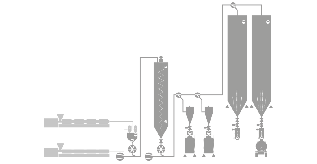 Kunststoffe werden gesammelt, gewaschen, zerkleinert, entstaubt und als sortenreines Mahlgut dem Extruder zugeführt. Nach dem Extrusionsprozess wird das Regranulat in Mischsilos homogenisiert, bevor es in BigBags oder Silofahrzeuge abgefüllt wird. Wir planen und realisieren Siloanlagen, die exakt auf Ihren Fertigungsprozess abgestimmt sind.