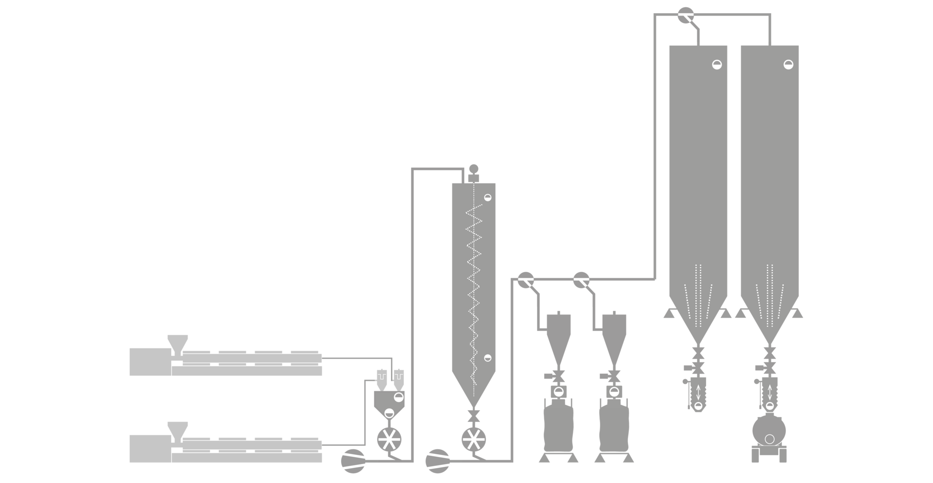 Die Abbildung zeigt den typischen Aufbau einer Materialversorgung in einem Spritzgussunternehmen für technische Kunststoffteile. Das Kunststoffgranulat wird in Granulatsilos gelagert, von dort auf die Trockner zugeführt und danach auf die einzelnen Spritzgussmaschinen verteilt. In unseren Silos und Kleinbehältern ist Ihr hochwertiges Kunststoffgranulat vor Verunreinigungen geschützt. Kupplungsbahnhöfe und Rohrsysteme werden von unseren Partnern (Hersteller von zentralen Materialfördersystemen) fachgerecht montiert, wobei Kupplungsbahnhöfe von ACHBERG auf Wunsch mit Codierung (RFID-Technologie) ausgestattet werden können.