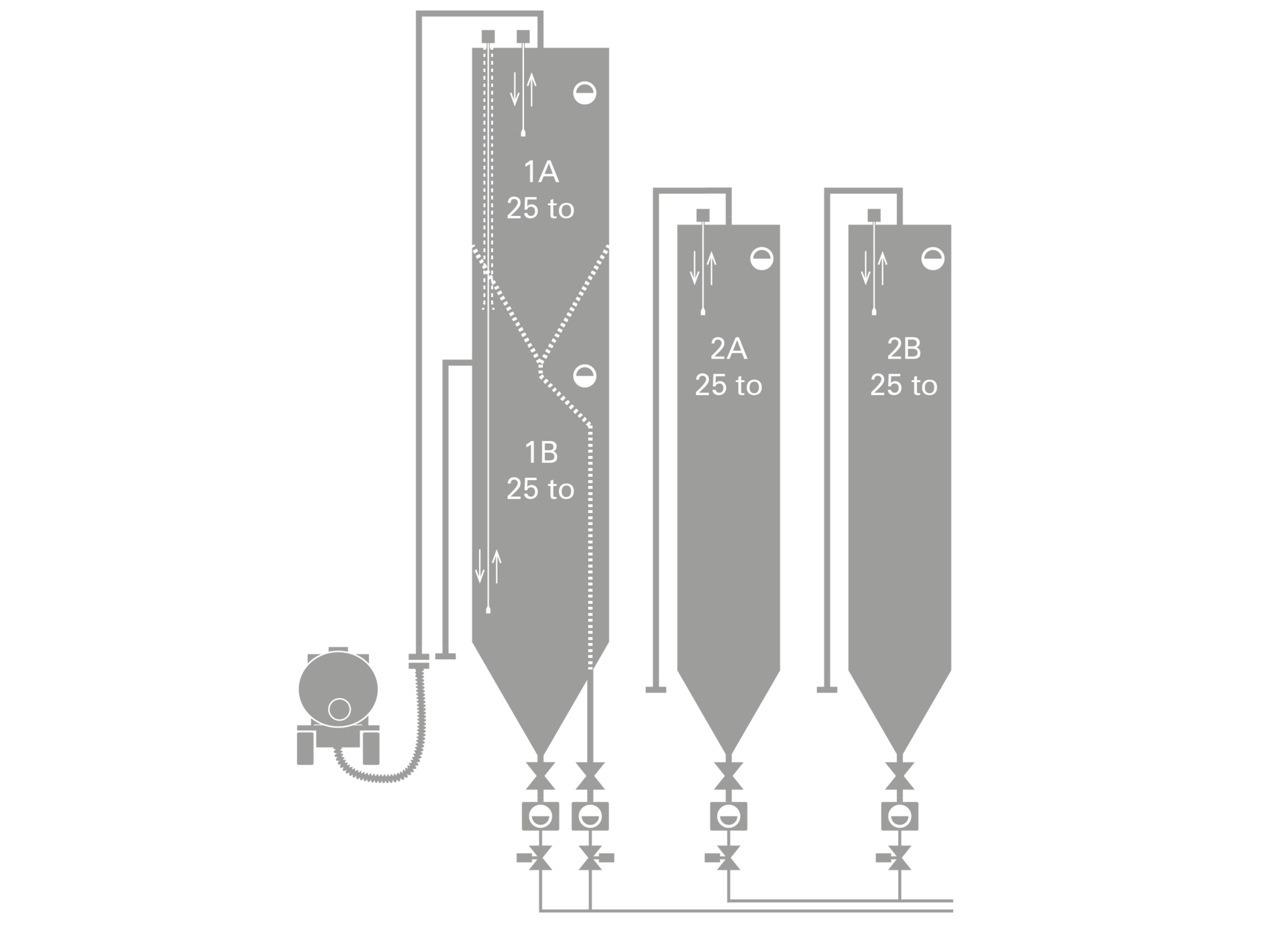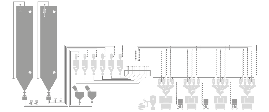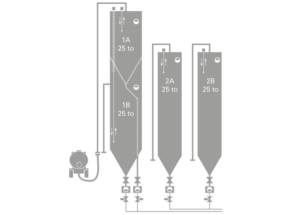 Für die Nachverfolgung von Chargen ist eine chargengetrennte Lagerung der Rohstoffe unerlässlich. Jede Charge, die ein Silofahrzeug anliefert (ca. 25 to), wird in eine separate Silokammer gefüllt. Die Entnahme erfolgt ebenfalls chargengetrennt. Wenn die Silokammer der Charge A leergesaugt ist, erfolgt eine automatische oder manuelle Umschaltung auf die Silokammer der Charge B. Hierzu öffnen und schließen unsere speziell dafür entwickelten pneumatischen Schieber an der Absaugstelle der Silo-Absaugkästen. Die Bedienung und Überwachung erfolgt am Touchpanel unserer Silosteuerung. Auf Wunsch protokollieren wir Chargenumschaltungen und stellen eine Schnittstelle zur übergeordneten Steuerung des Materialfördersystems zur Verfügung.