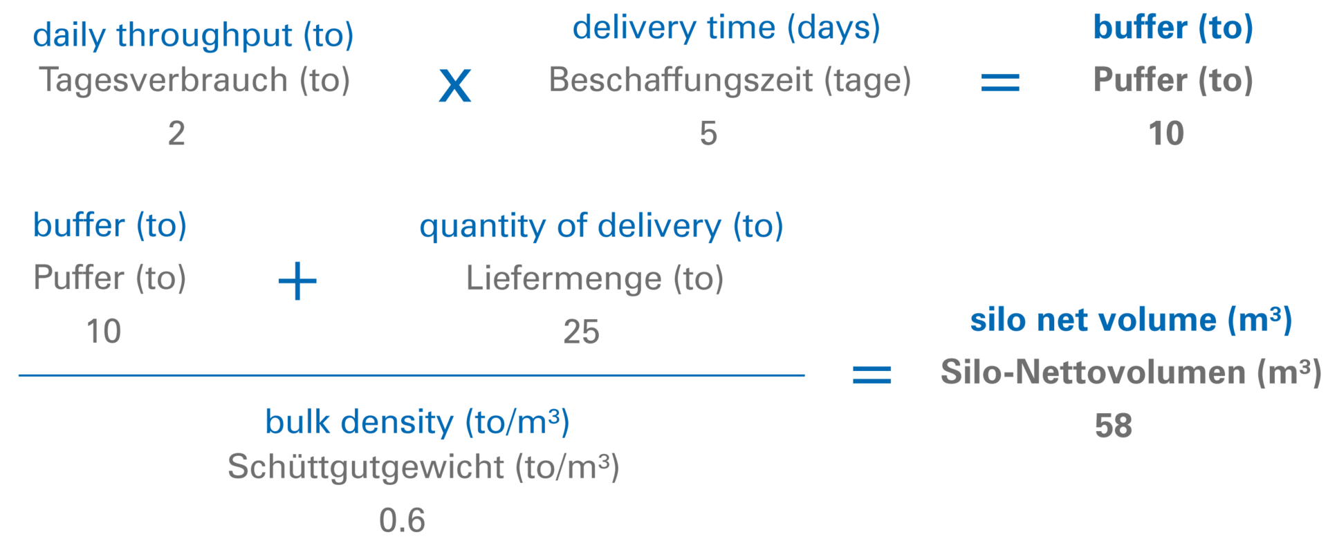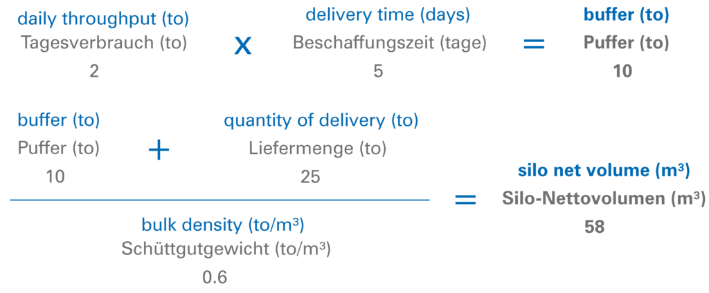 Die Liefermenge (Fassungsvermögen des Silofahrzeuges) beträgt 25 to. Das Schüttgewicht wurde in der Beispielrechnung mit 0.6 to/m³ angenommen.